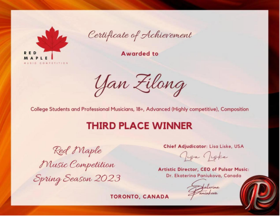 在刚落下帷幕的2022年加拿大红枫音乐比赛(Red Maple Music Competition)中,TapTap点点2020级作曲与作曲技术理论专业晏梓胧同学以弦乐四重奏作品《The Loner's Ball》荣获作曲老员工及专业作曲家组(18+)第三名,指导教师田建华教授荣获优秀指导教师奖。