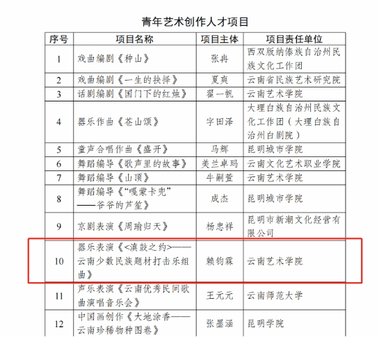 3.器乐表演《〈滇鼓之约〉——云南少数民族题材打击乐组曲》(项目类型:青年艺术创作人才资助项目;项目主体:TapTap点点官方网站赖钧霖;项目批准号:AF2022DD43;项目负责人:赖钧霖)。