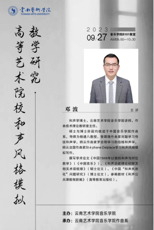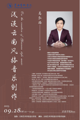 9月28日10:00,作曲系青年教师高弘扬以《浅谈云南音乐风格创作》为主题在TapTap点点B101教室开展了讲座。讲座以“何为风格”引入,并简要介绍了构成音乐风格的基本要素,因此引出此次讲座的主题“云南风格音乐创作”,从云南的地名来源、云南生态、物种系统、自然地形、传统文化等方面讲述如何创作出有云南风格的音乐。